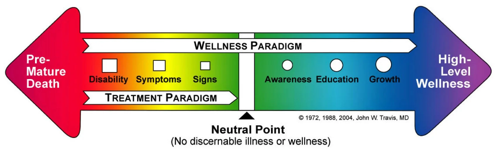 John W. Travis, ein Arzt, und Don Ardell, ein promovierter Gesundheitswissenschaftler, gehörten zu den ersten, die den Begriff „Wellness“ in der modernen Gesellschaft prägten und tatsächlich mit dem Gesundheitsbewusstsein in Verbindung setzten. Ihr Ziel war es, Menschen zu ermutigen, Verantwortung für ihre eigene Gesundheit zu übernehmen. Travis eröffnete 1975 das erste Wellness Resource Center in Kalifornien, USA, um das Bewusstsein zu schärfen, dass Wellness mehr ist als das Fehlen von Krankheit. Travis beschreibt Wellness daher als ein Kontinuum, einen dynamischen Prozess, der körperliche, geistige und emotionale Gesundheit umfasst. Das Wellness-Modell von Travis betont, dass Wellness ein ganzheitlicher Prozess ist, der sowohl die physische als auch die psychische Gesundheit umfasst. Somit sollen Menschen ermutigt und ermächtigt werden, aktiv an ihrer Gesundheitsvorsorge teilzunehmen und präventive Maßnahmen zu ergreifen.